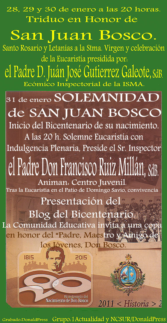 Durante los días 28, 29 y 30 de enero, a las 20:00 horas, tendrá lugar en la Basílica de María Auxiliadora, en la Casa Salesiana de la Stma. Trinidad, el Triduo en Honor de San Juan Bosco, “Padre, Maestro y Amigo de los Jóvenes.